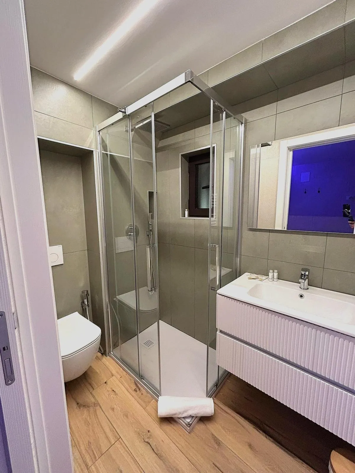 Con doccia, set di cortesia, asciugamani e asciugacapelli.